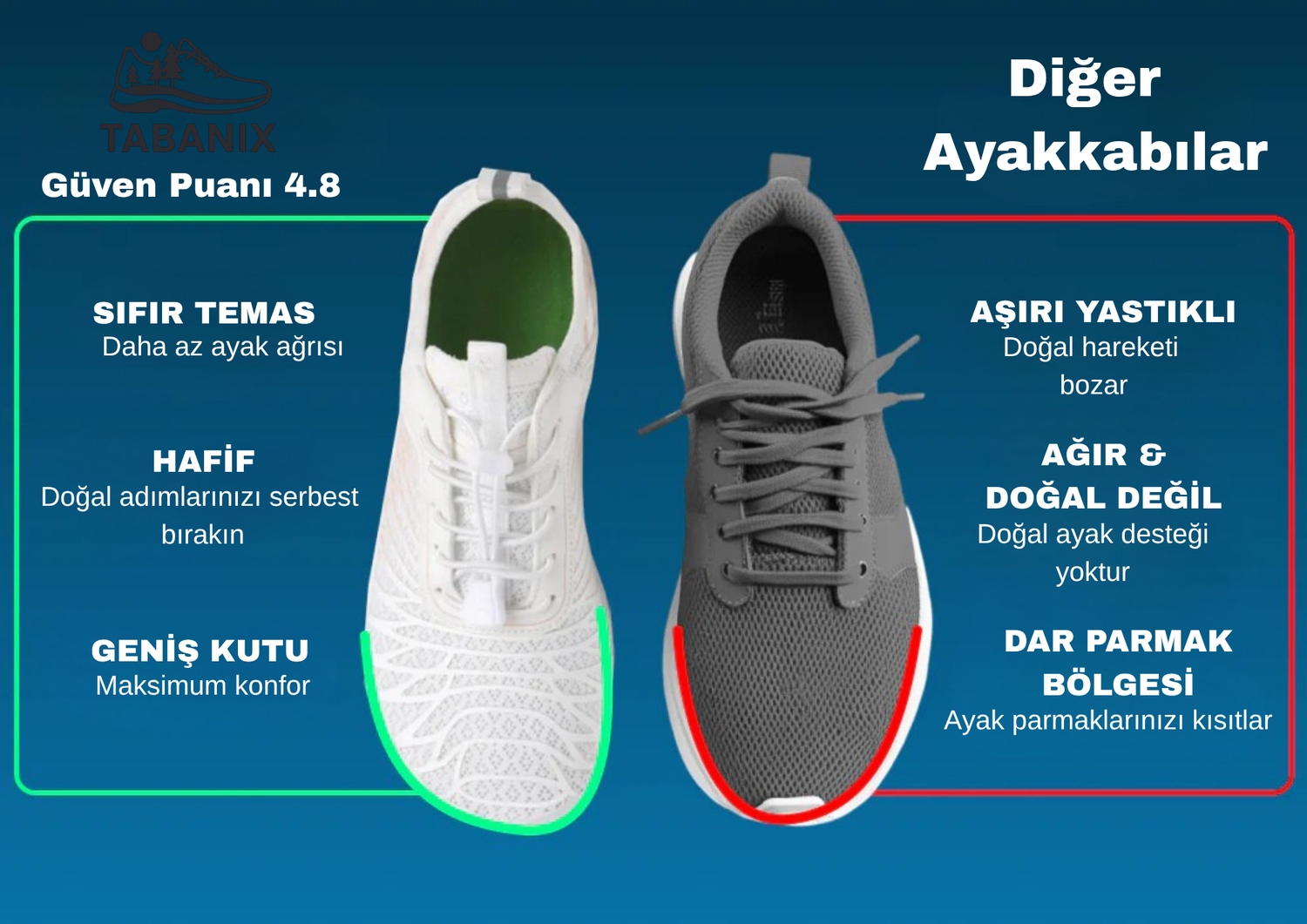 Tabanix Ortopedik Ayakkabılar, modern ayakkabıların elimizden aldığı şeyleri geri kazandırmak için tasarlanmıştır: gerçek hareket, gerçek bağlantı ve gerçek rahatlama. Sıfır düşüş tabanı, geniş burun kısmı ve bakır topraklama fişi ile donatılmış çıplak ayak ayakkabılarımız, iltihabı azaltır, dolaşımı iyileştirir ve tüm vücut hizalamasını destekler. Şişmiş ayaklar, diyabetik ayak bakımı ve ağrısız bir yaşam arayan herkes için idealdir. İyileştiren konfor. Topraklama teknolojisi. Önemli hareket.